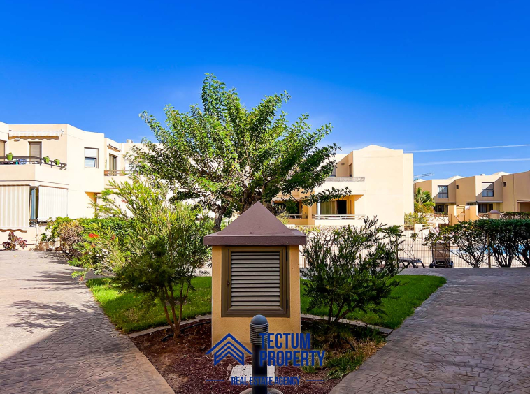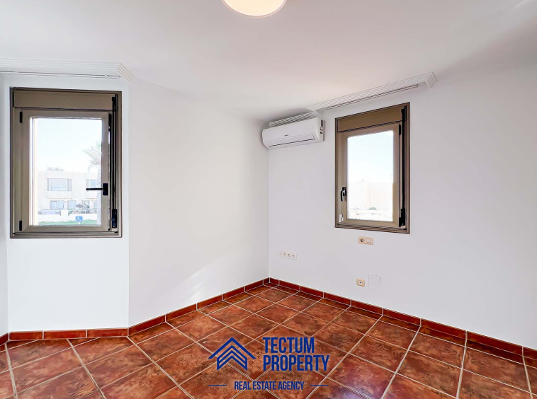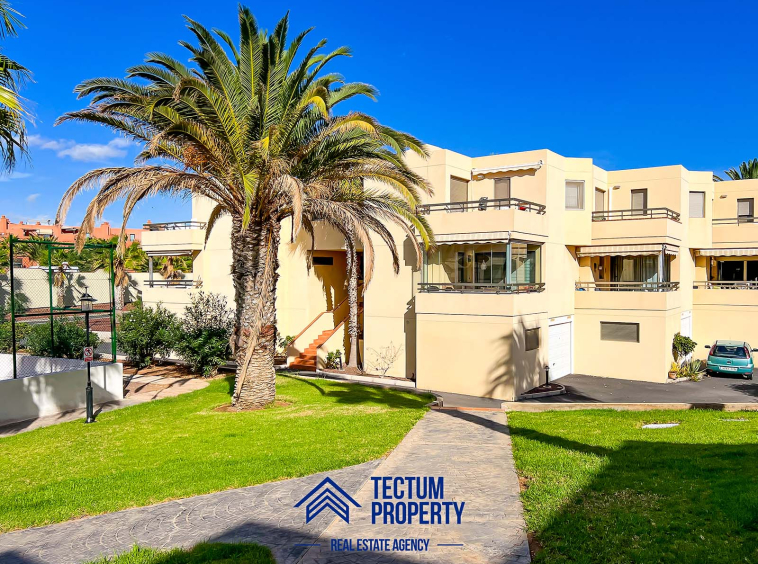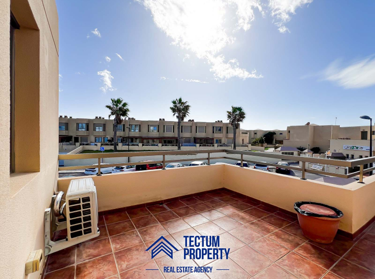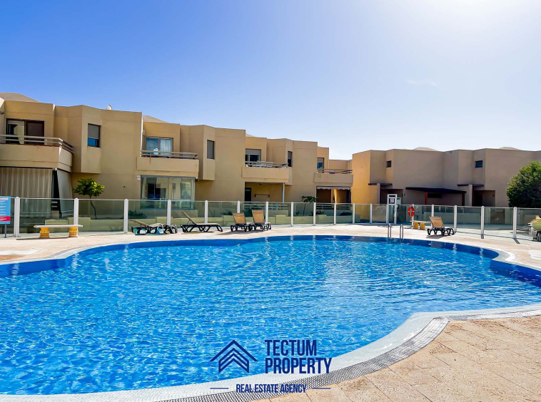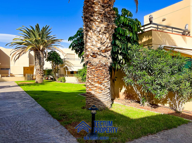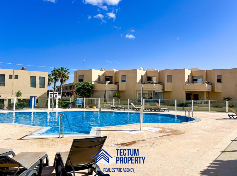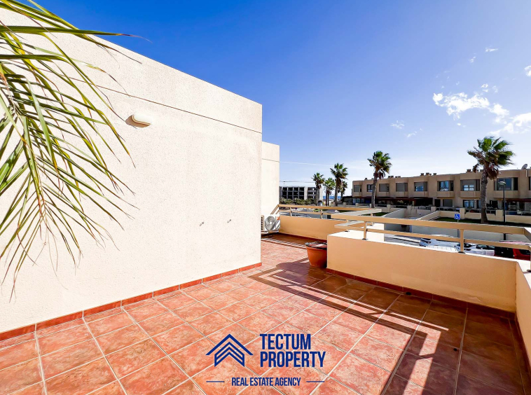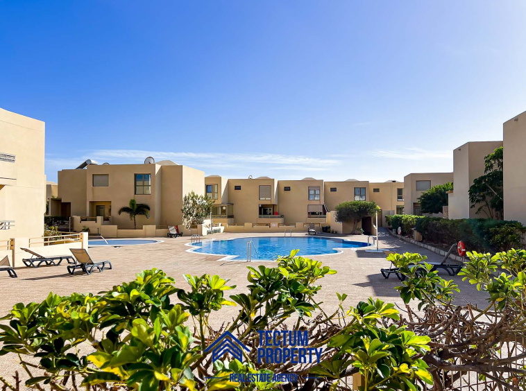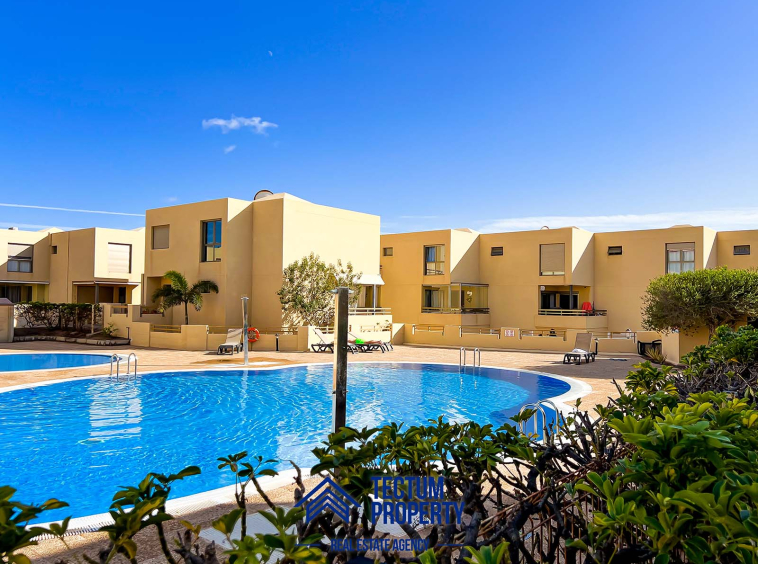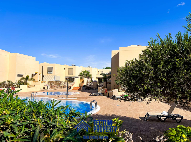 Townhouse in La Tejita, Sotavento II residential complex. The property has 223 m2 of living space and comprises 3 spacious bedrooms, 2 bathrooms, a large and bright living room, an open-plan kitchen, and several sunny terraces. It also includes a private garage and 2 storage rooms. The house has been recently painted and features air conditioning. It is located in a well-maintained complex with a communal swimming pool and landscaped gardens. Just a 5-minute walk from the beach.